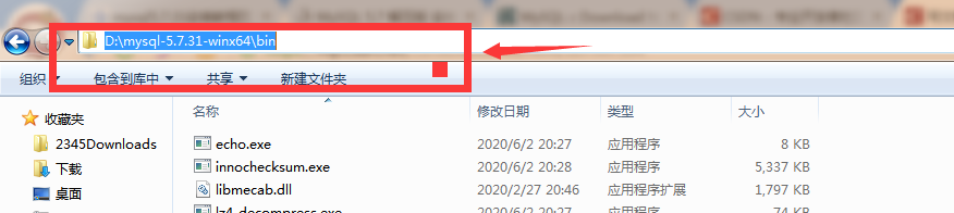 打开MySQL的bin目录,点击红框的位置,此时MySQL的bin目录的路径会被选中,先复制此路径,之后会用到。