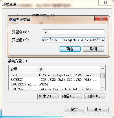 在系统变量中找到并双击Path 讲刚刚的路径添加进去 以;分割开