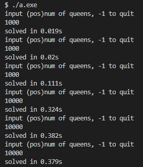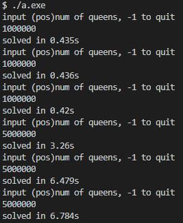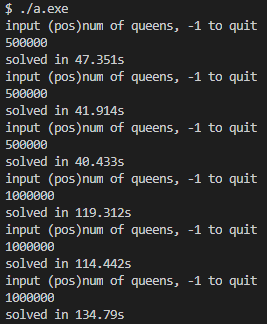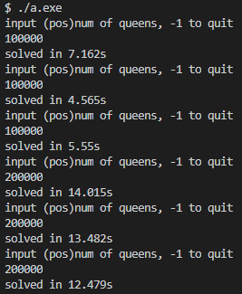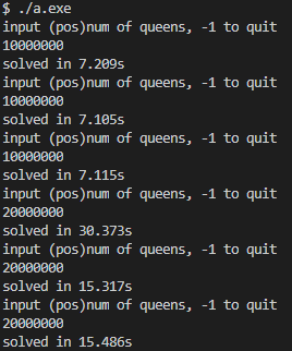 最终结果如下图所示,解 n = 1000000 n=1000000 n=1000000仅需 0.4 0.4 0.4秒,解 n = 5000000 n=5000000 n=5000000平均时间 5.5 5.5 5.5秒,解 n = 10000000 n=10000000 n=10000000平均时间 9.84 9.84 9.84秒,解 n = 20000000 n=20000000 n=20000000平均时间 20.392 20.392 20.392秒,v2版本可以快速解决千万级别的n皇后问题。