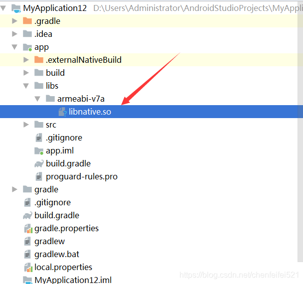 在app目录下创建libs目录,android studio3.4中创建的工程每次都默认带有这个目录,没有就自己创建一个,然后在这个文件夹下创建armeabi-v7a文件夹,这个文件夹下放的.so动态库是为了给arm v7架构的设备用的,如果是要在x86架构的环境中调用.so动态库,需要建立x86文件夹,然后将对应的动态库放到x86文件夹下。
