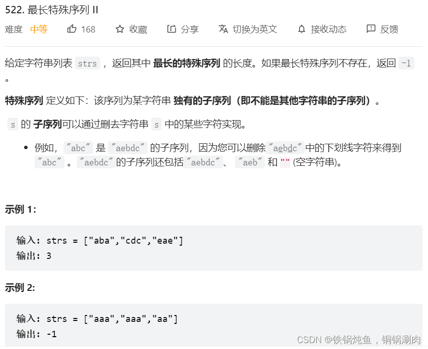 将strs[ ]按照字符串的长度排序,找到每个字符串会不会是其他字符串的字串,如果不是,返回它的长度,如果没有特殊的序列,返回-1。
