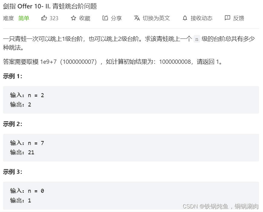 该题可通过递推解决,f(0) = 1, f(1) = 1。当n = 2时,可以在n = 0的情况下跳2级,或者n = 1的情况下跳2级,两种方式来实现,所以f(2) = f(1) + f(0)。依次类推,f(n) = f(n-1) + f(n-2)。