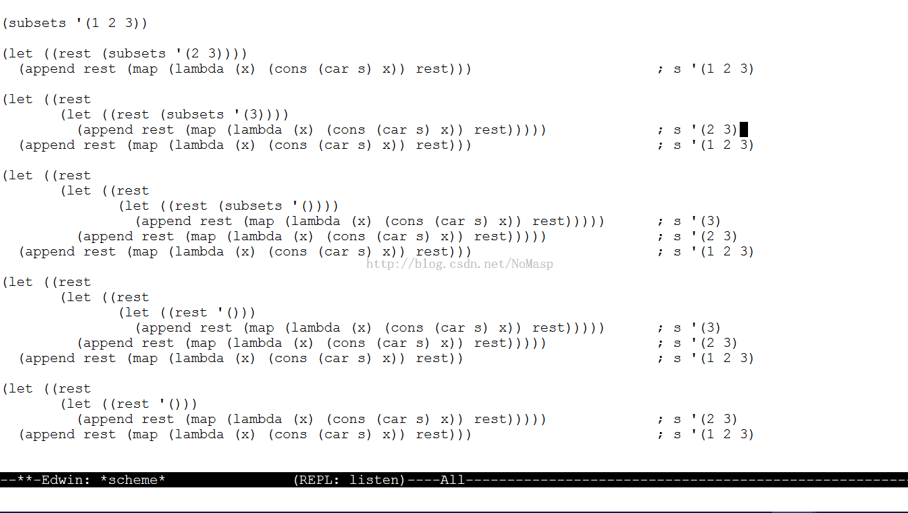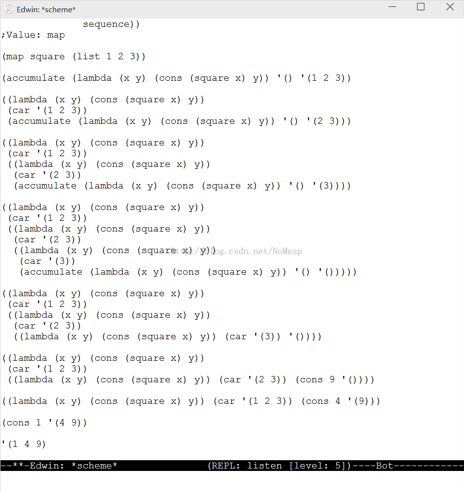这里的nil也是’(),其作为accumulate的参数initial。后面的sequence也就是accumulate的参数sequence。那么lambda表达式里要做的就是处理这些东西了。我们用map的参数来处理初始值,然后将其用cons组合。而很明显的,nil对应于x,seguence对应于y。于是乎。
