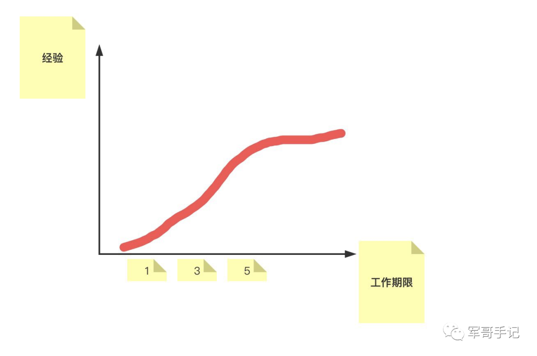 通常情况下,新手入行,刚工作1到2年,经验增长最快,但是边际效应递减,到了5年左右,增长逐渐放缓。如下图: