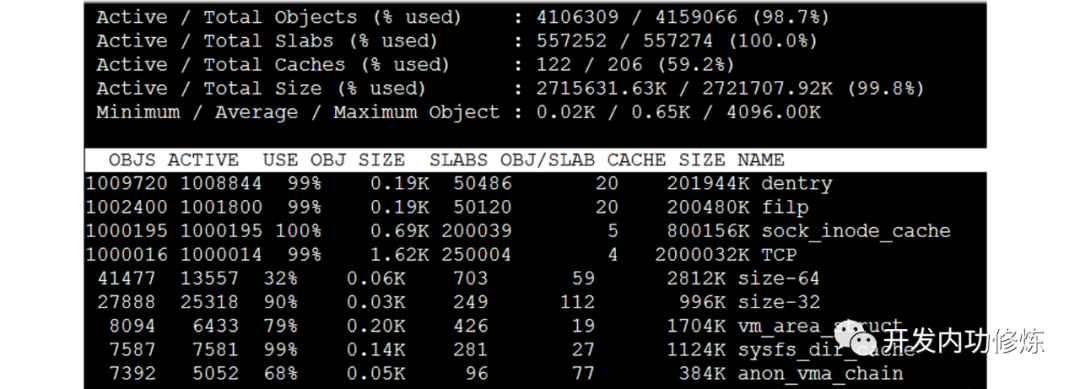 通过slabtop命令可以查看到densty、flip、sock_inode_cache、TCP四个内核对象都分别有100W个: