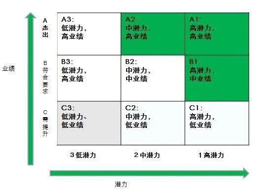 九宫格人才盘点法,就是根据业绩和潜力两个维度,将人才分成九个区域,一般处于A1、A2、B1三个区域的员工为重点培养对象。针对处于不同区域可以采取不用的人才培养方案。