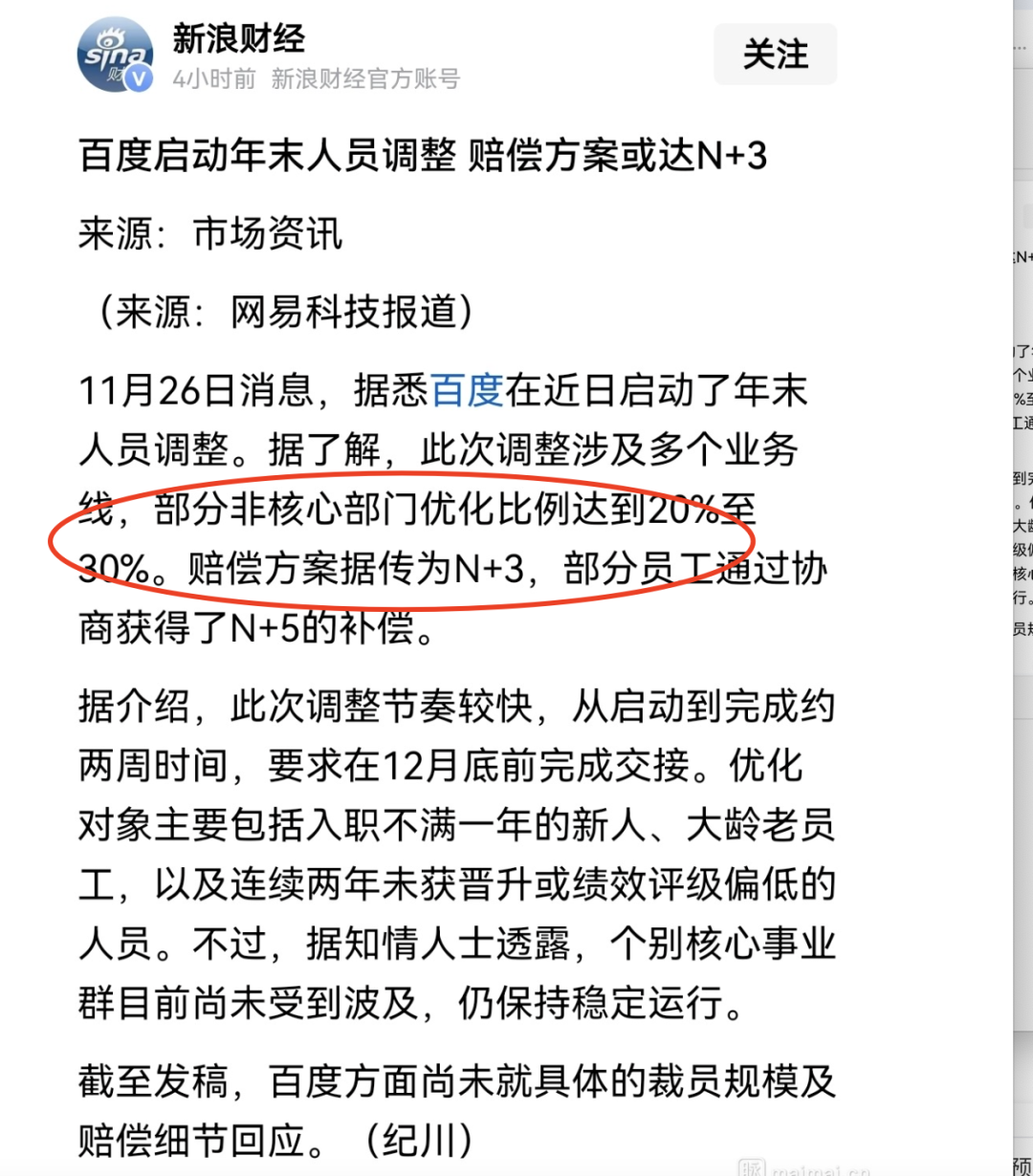 最近不是 baidu 还有 beike 等等公司裁员,据说百度 20% 以上(见下图),闹的沸沸扬扬,我相信很多同学应该都知道了。