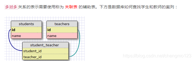 多对多关系有点复杂。例如,考虑一个拥有students和teachers的数据库,可以说一个学生有很多个老师,一个老师有很多个学生。这就像来自两端的两个重叠的一对多关系