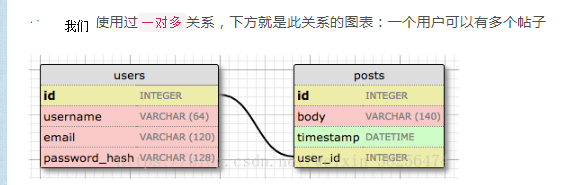 通过这个关系连接的两个实体分别是用户,帖子。一个用户有很多篇帖子,每个帖子有一个用户。在数据库中,这个关系在多侧使用外键。在上述关系中,外键user_id字段添加到posts表中。这个字段将每个帖子连接到user表中其作者的记录。