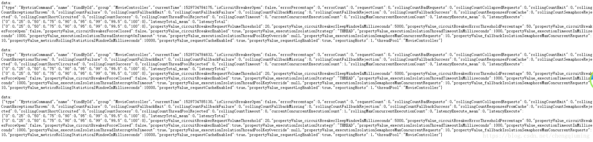 http://localhost:8010/hystrix.stream,可看到页面会重复出现类似于下面的内容: