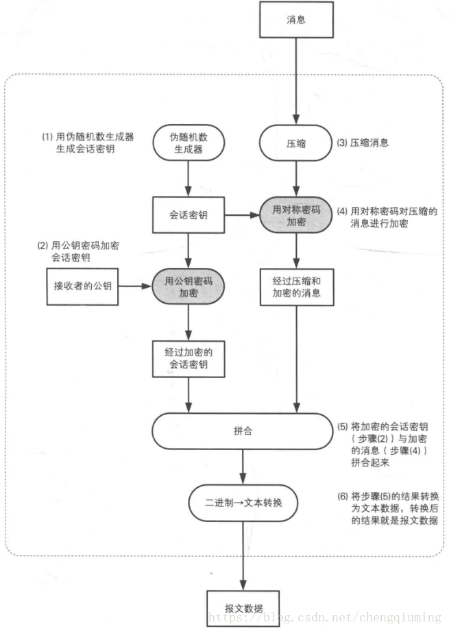 PGP的加密过程如下图,在这张图中,消息是经过混合密码系统进行加密,然后转换成报文数据(文本数据)。
