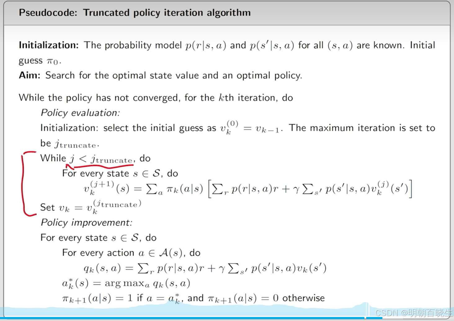 截断策略迭代算法(Truncated Policy Iteration Algorithm)是强化学习中一种结合策略迭代(Policy Iteration)和值迭代(Value Iteration)思想的优化算法,通过截断策略评估步骤在计算效率与收敛性之间取得平衡。