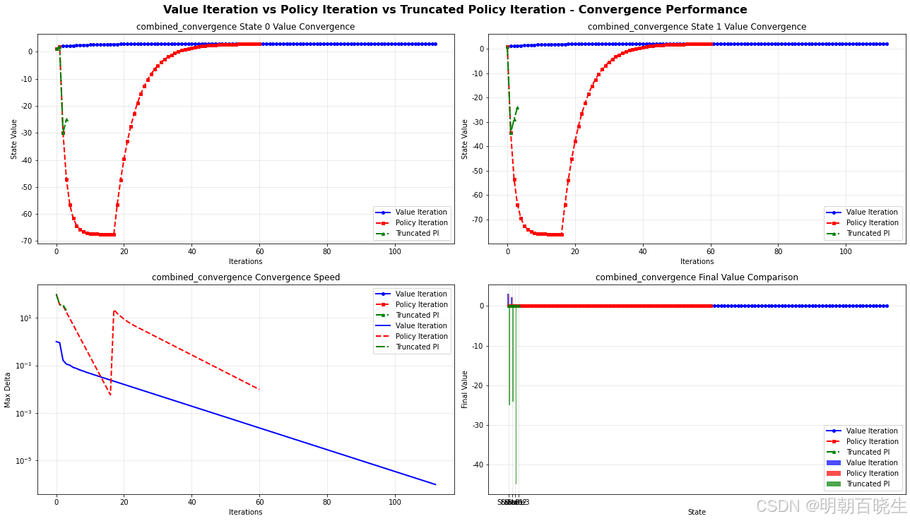 | 计算效率高:通过截断策略评估减少单次迭代时间,尤其适用于大规模状态空间。 | 收敛速度可能较慢:截断可能导致价值函数估计不精确,需更多迭代达到收敛。 |