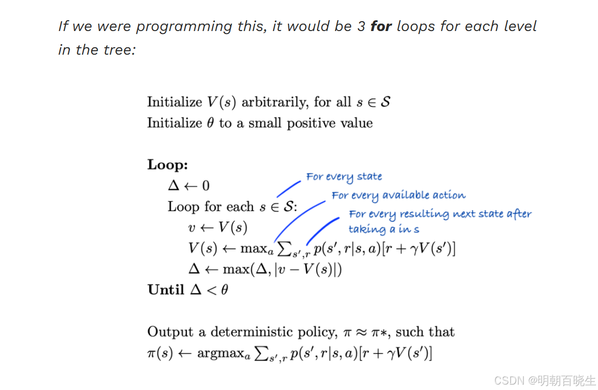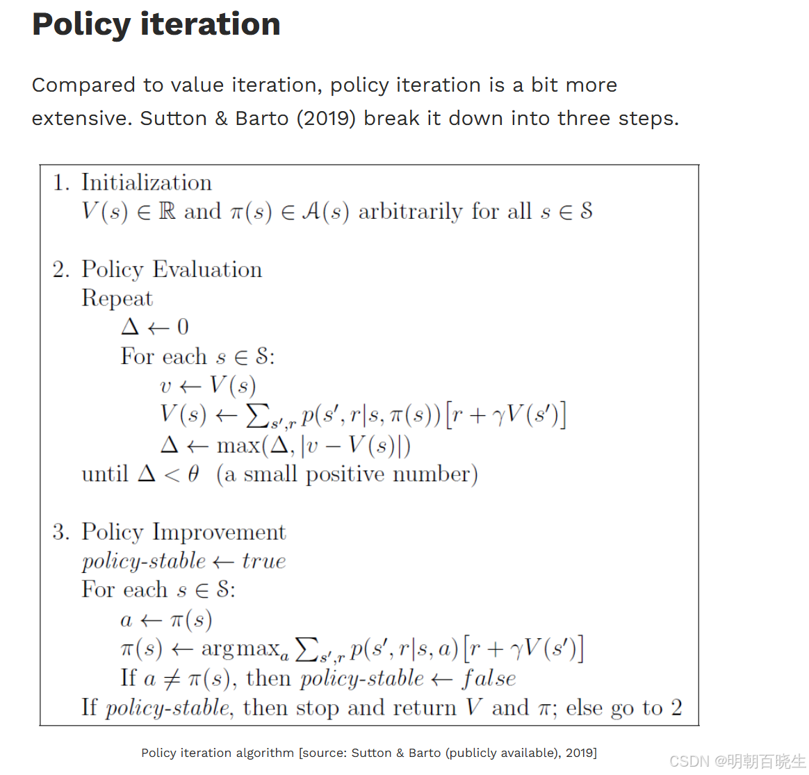 - 策略评估(Policy Evaluation):计算当前策略下的状态价值函数 Vπ(s),通常需多次迭代直至收敛。