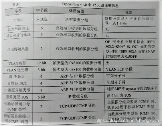 在Openflow v1.0中,流表项的分组头与包括了12个字段,协议称其为12元组,它提供了一到四层的网络控制信息,包括入端口,以太网原地址、以太网目的地址。以太网帧类型、Vlan标识、vlan优先级、源IP地址、目的IP地址、破数据分组类型、服务类型TOS、传输层源端口号/ICMP类型,传输层目的端口号?ICMP码值。