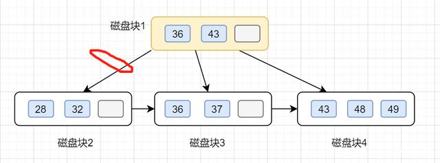 Ⅰ、第一次磁盘 I/O,查找磁盘块1,即根节点(36,43),因为32小于36,因此访问根节点的左边第一个孩子节点。