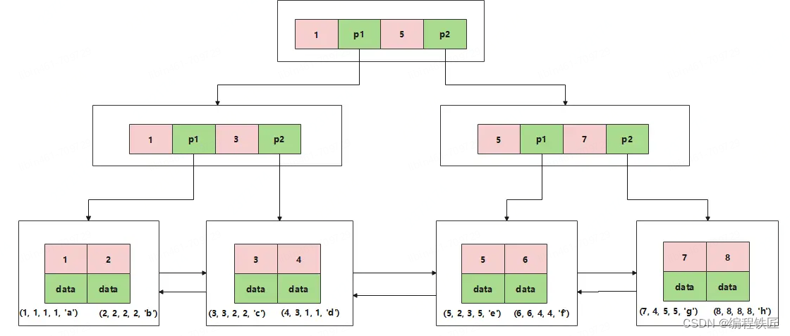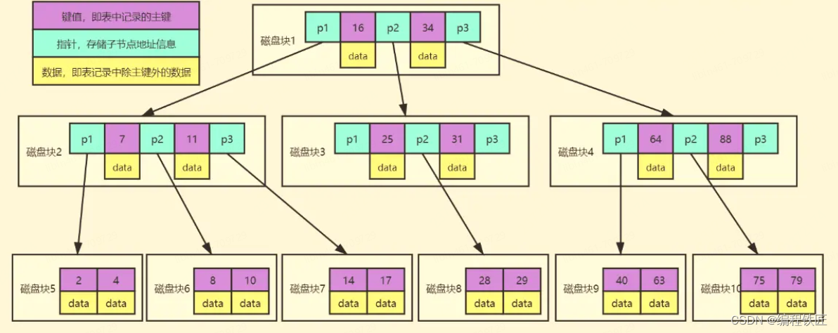 每个结点中存储了关键字(key)和关键字对应的数据(data),以及孩子结点的指针。我们将一个key和其对应的data称为一行记录。