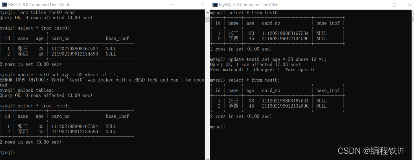 Ⅳ、会话A执行UPDATE,直接报错Table 'test0' was locked with a READ lock and can't be updated;