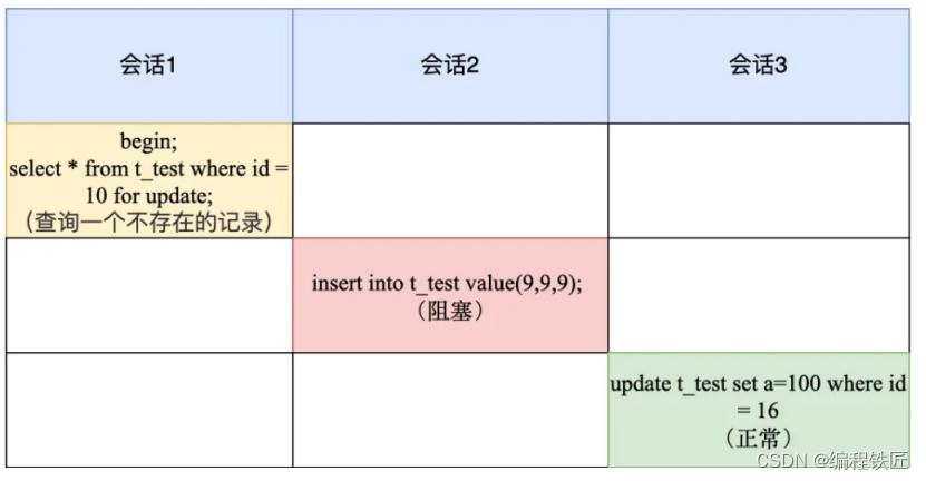 Ⅲ、会话 2 因为往间隙锁里插入了 b = 9 的记录,所以会被锁住,而 b = 16 是没有被加锁的,因此会话 3 的语句可以正常执行。