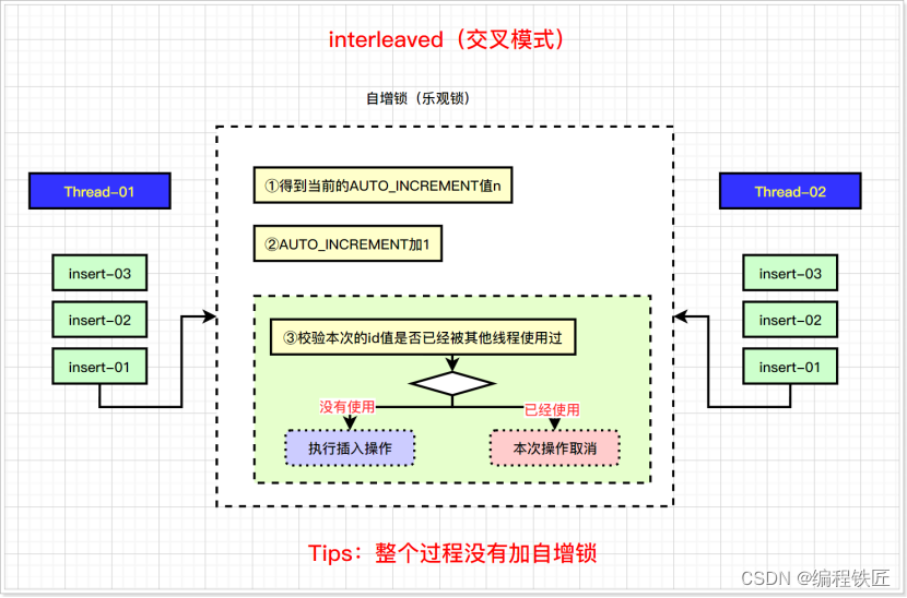 InnoDB_autoinc_lock_mode = 2(“交错”锁定模式) ,从MySQL8.0开始,交错模式是默认设置。 在这种锁定模式下,所有类INSERT语句都不会使用表级AUTO-INC锁,而是使用较为轻量的mutex锁,并且可以同时执行多个语句。这是最快和最可扩展的锁定模式。副作用就是单个Insert的自增值有可能是不连续的,因为AUTO_INCREMENT的值会在多个INSERT语句中来回交叉执行。