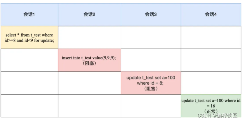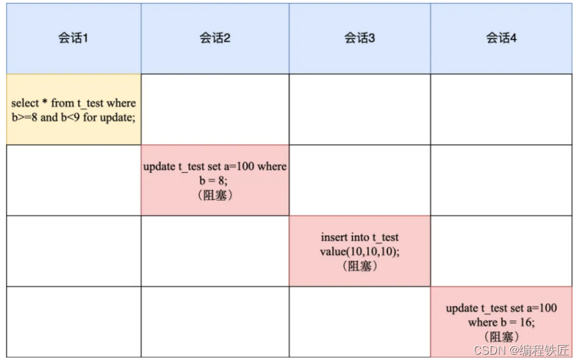 Ⅳ、会话 2 往间隙锁里插入 id = 9 的记录就会被锁住,而会话 3 和会话 4 在next-key lock 范围里的记录而被锁住的。