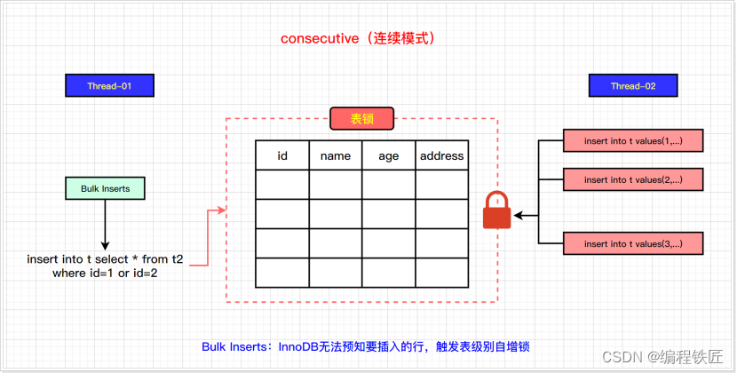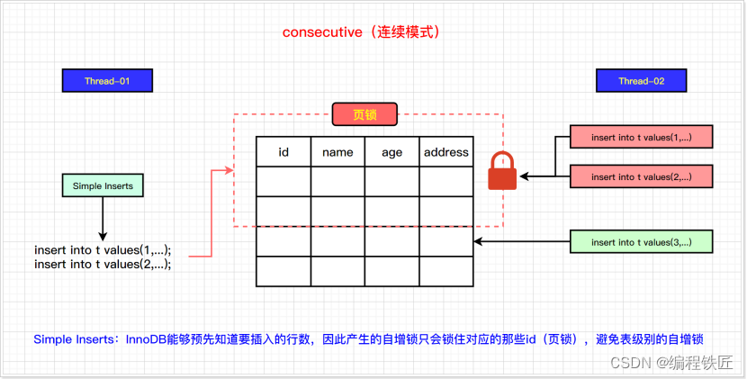 InnoDB_autoinc_lock_mode = 1(“连续”锁定模式) ,在MySQL8.0之前,连续锁定模式是默认的。 在这个模式下,“bulk inserts”仍然使用AUTO-INC表级锁,并保持语句结束。这适用于所有INSERT … SELECT,REPLACE … SELECT和LOAD DATA语句。同一时刻只有一个语句可以持有AUTO-INC锁; 对于“Simple inserts”(要插入的行数事先已知),则通过mutex(轻量锁)的控制下获得所需数量的自动递增值来避免表级AUTO-INC锁,它只在分配过程的持续时间内保持,而不是直到语句完成。不使用表级AUTO-INC锁,除非AUTO-INC锁由另一个事务保持。如果另一个事务保持AUTO-INC锁,则“Simple inserts”等待AUTO-INC锁。