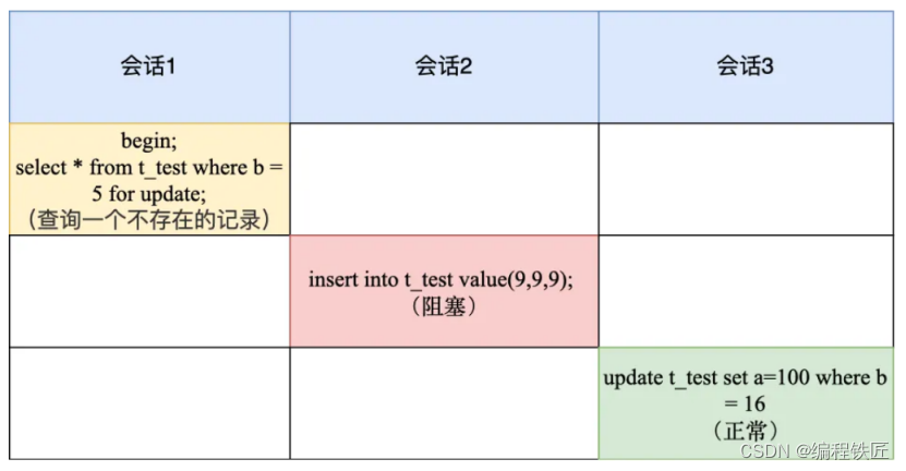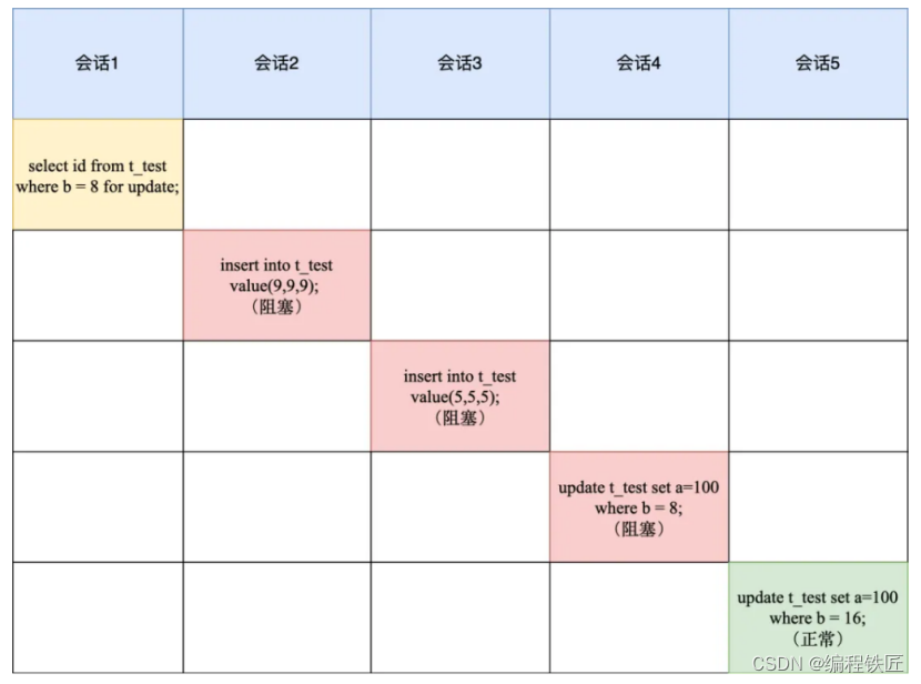 Ⅴ、 b = 16 这条记录没有加锁,所以会话 5 是可以正常执行的。