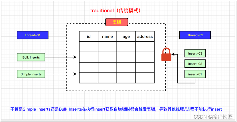 注意:自增锁跟事务无关,即使多个insert语句存在同一个事务中,每次insert都会申请最新的自增锁来获取最新的AUTO_INCREMENT值;自增锁保持到insert语句结束,而不是事务结束;