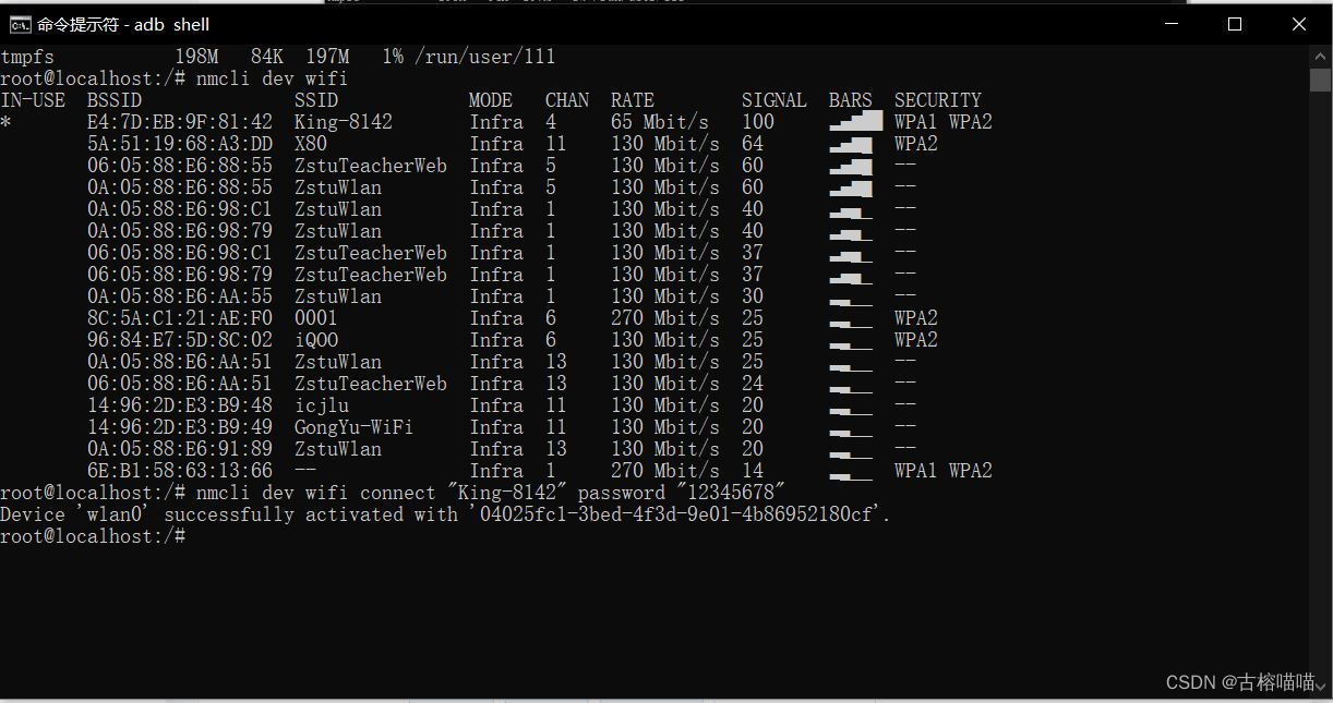首先查看可用的wifi网络,然后连接选定的wifi。