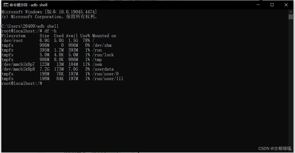写入完成后重启开发板,通过USB链接开发板,测试ADB远程连接。通过df -h查看各个部分的文件内存。