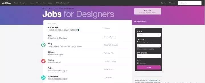 你没看错,Dribbble 不只是全球最受欢迎的设计师社区,同样是设计师寻找远程工作的好出处。自从被 Tiny 收购后,Dribbble 的招聘属性正在慢慢增强,试着持续 PO 出自己的好作品,等待你的伯乐,同样你可以关注 Jobs 页面,给心仪的 Team 提交简历。