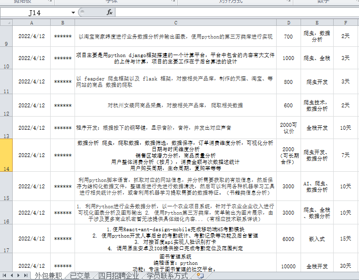 选择适合自己的,能够确保完成。大家可以收藏以下网站,都是可以用来接单兼职的平台。大量的编程语言接单平台,来自各行各业,报酬低至100左右,高达上万不等。微信搜索公众号:Python教程网,回复:Python 领取资料 。