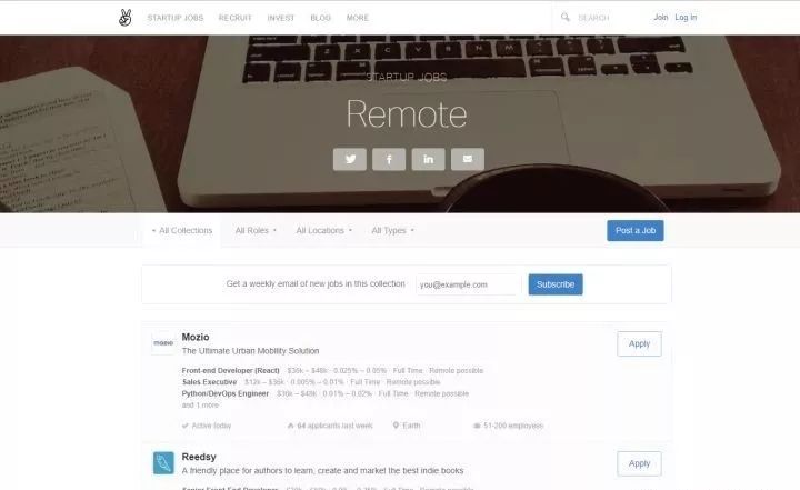 AngelList 主要是服务于初创公司和天使投资人的平台,这里还有初创公司提供的远程工作的机会,如果对远程加入初创公司感兴趣的,可以尝试一下。