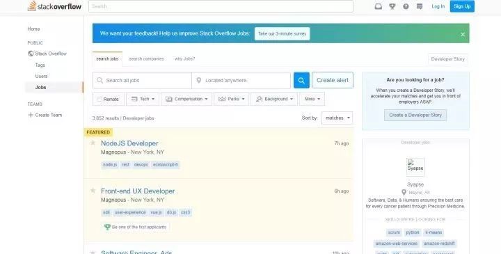 被广大程序员熟知的 Stackoverflow 本身就是一个全民远程工作的公司,程序员在远程工作中有很大的先天优势,Stackoverflow Jobs 里有远程职位的筛选,这里有丰富的远程技术职位。