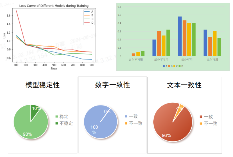 如图3所示,在同样的数据集和微调方式下,不同模型的表现各异。总结而言,微调后的大模型A在该场景中的表现尤为突出,其生成的工单小结整体可用率达到了80%,其中投诉工单可用率在87%,数字一致性达到100%,文本一致性达到96%,多次生成文本内容的过程中输出结果的稳定性为90%。实验证明第三种应用范式,即微调大模型在该场景下显示出较高的实用性,且高质量的微调数据可使模型生成幻觉的概率被有效控制。