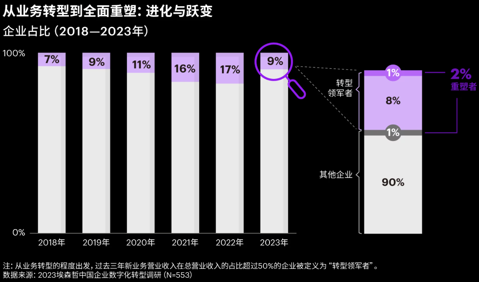然而,如蒙牛、海底捞一样在过去几年投资创新技术并获益的企业是少数。国际管理咨询和信息技术服务公司埃森哲发布的《2023中国企业数字化转型指数》显示,受宏观环境影响,中国企业聚焦运营和成本优化,创新力度明显减弱,2023年业务创新活跃的企业占比降至9%,较2022年下降约一半。过去六年,参与数字化业务创新的被调企业占总数的峰值为17%。