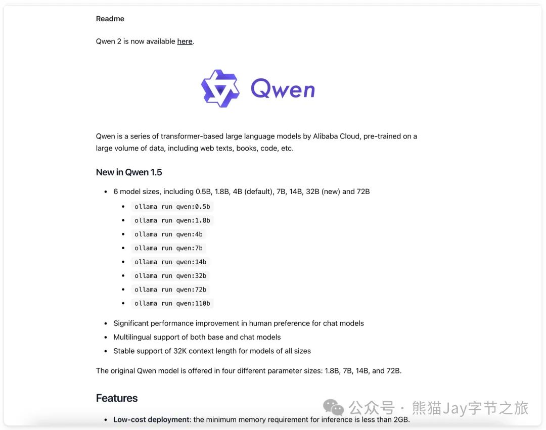 2、搜索对应模型。发现目前有 Qwen 0.5B ~ 110B 可供使用。