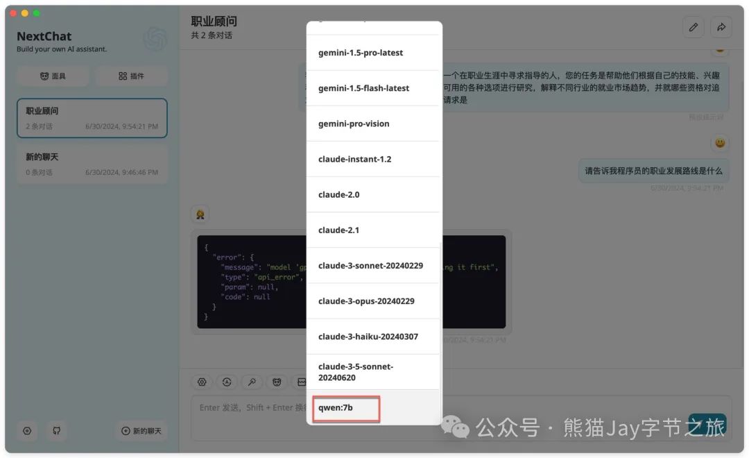 使用面具对话功能时,需要注意,软件模型忽略了自定义的 qwen:7b,每次利用面具对话时,需要重新选择模型。