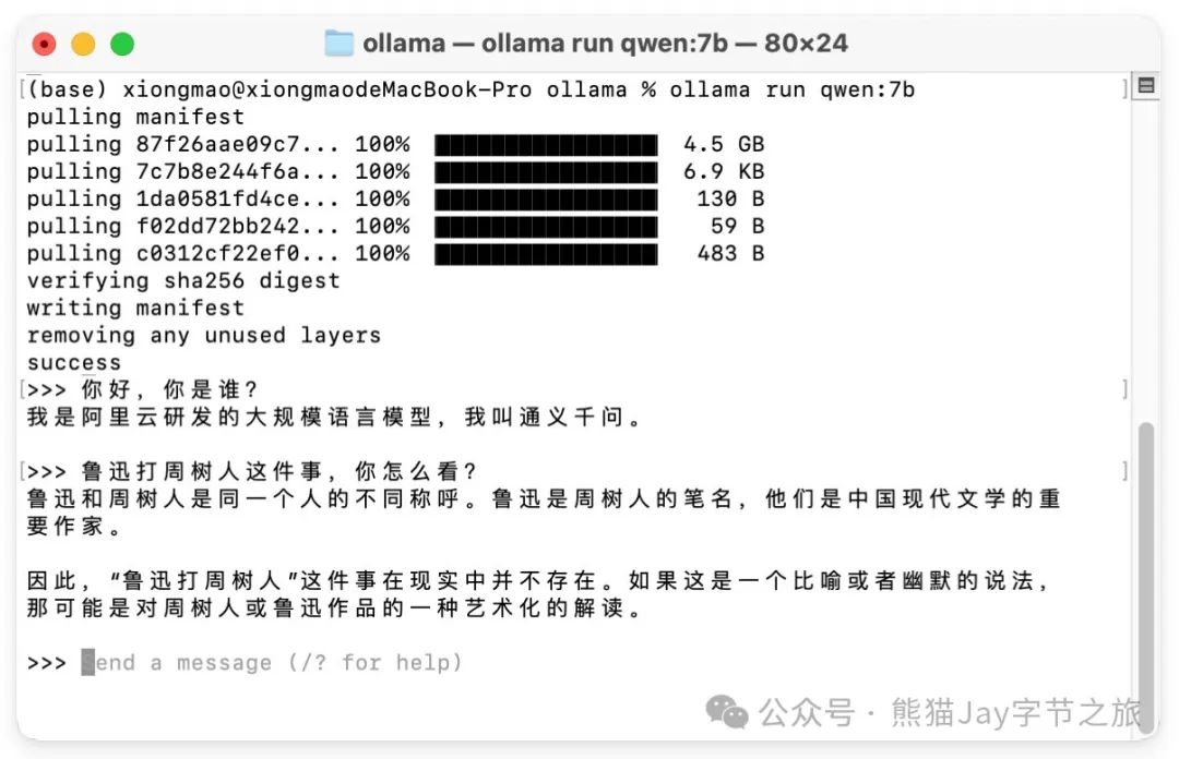 因为内存不够用,最终选择下载 Qwen:7b,大家可以按照自身硬件情况下载模型。