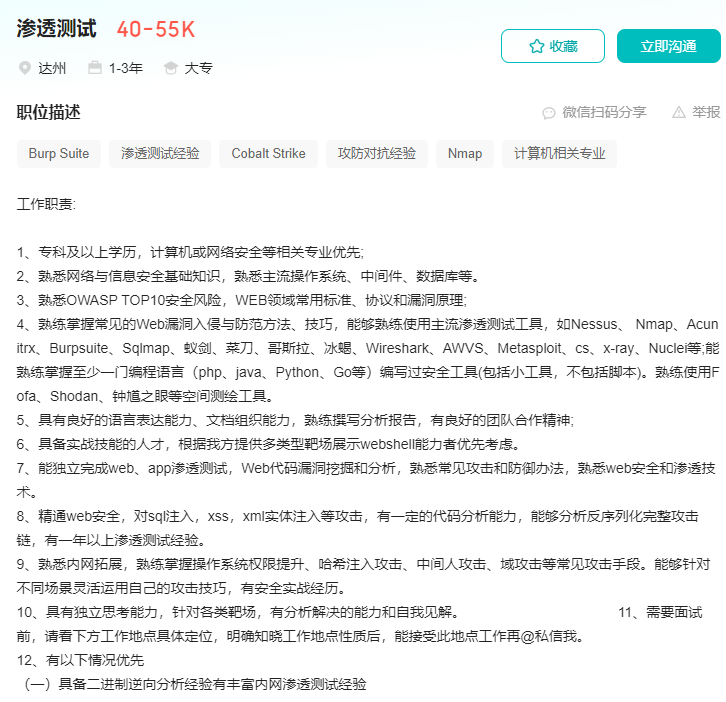 某知名安全厂商招聘的高级渗透测试工程师薪资达45-75K·15薪,经验要求相对灵活;