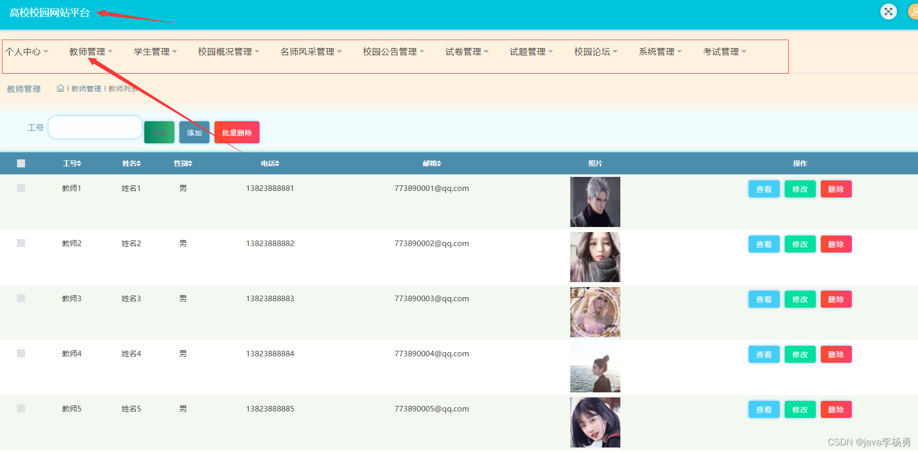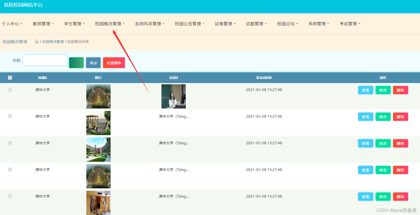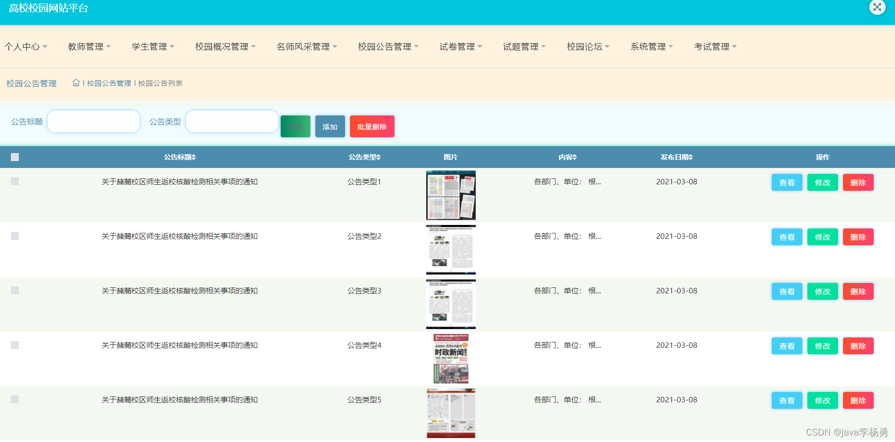 管理员主要功能:进入校园网站可以查看个人中心、教师管理、学生管理、校园概况管理、名师风采管理、校园公告管理、试卷管理、试题管理、校园论坛、系统管理、考试管理等信息