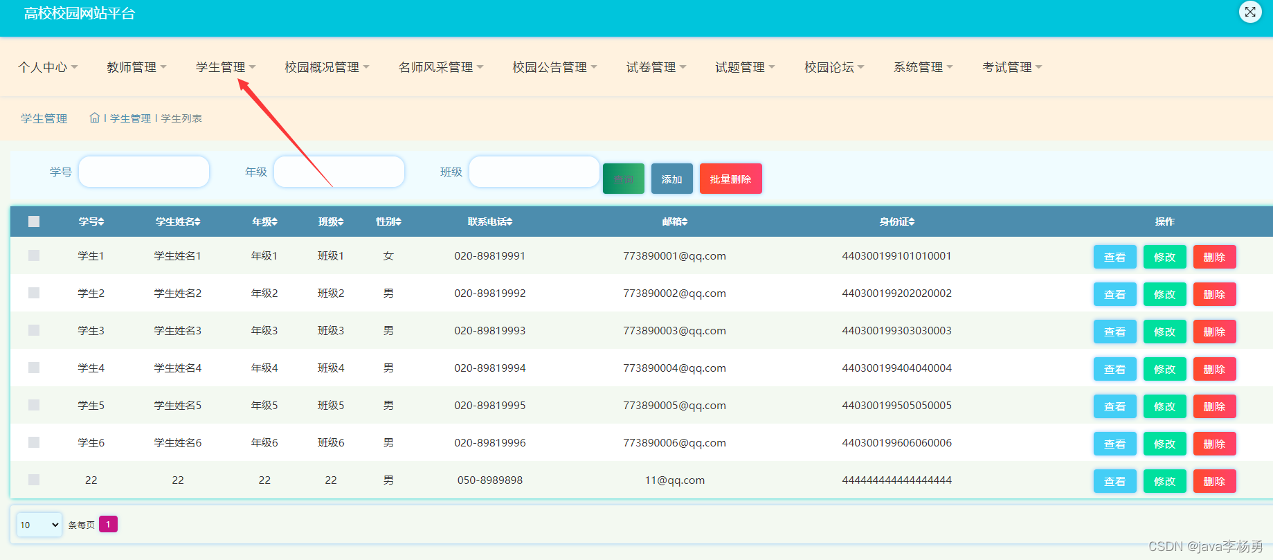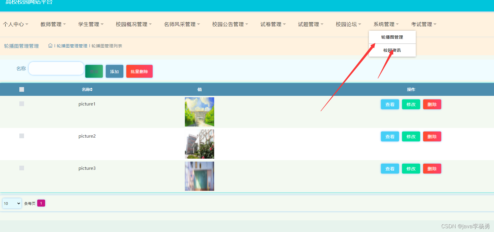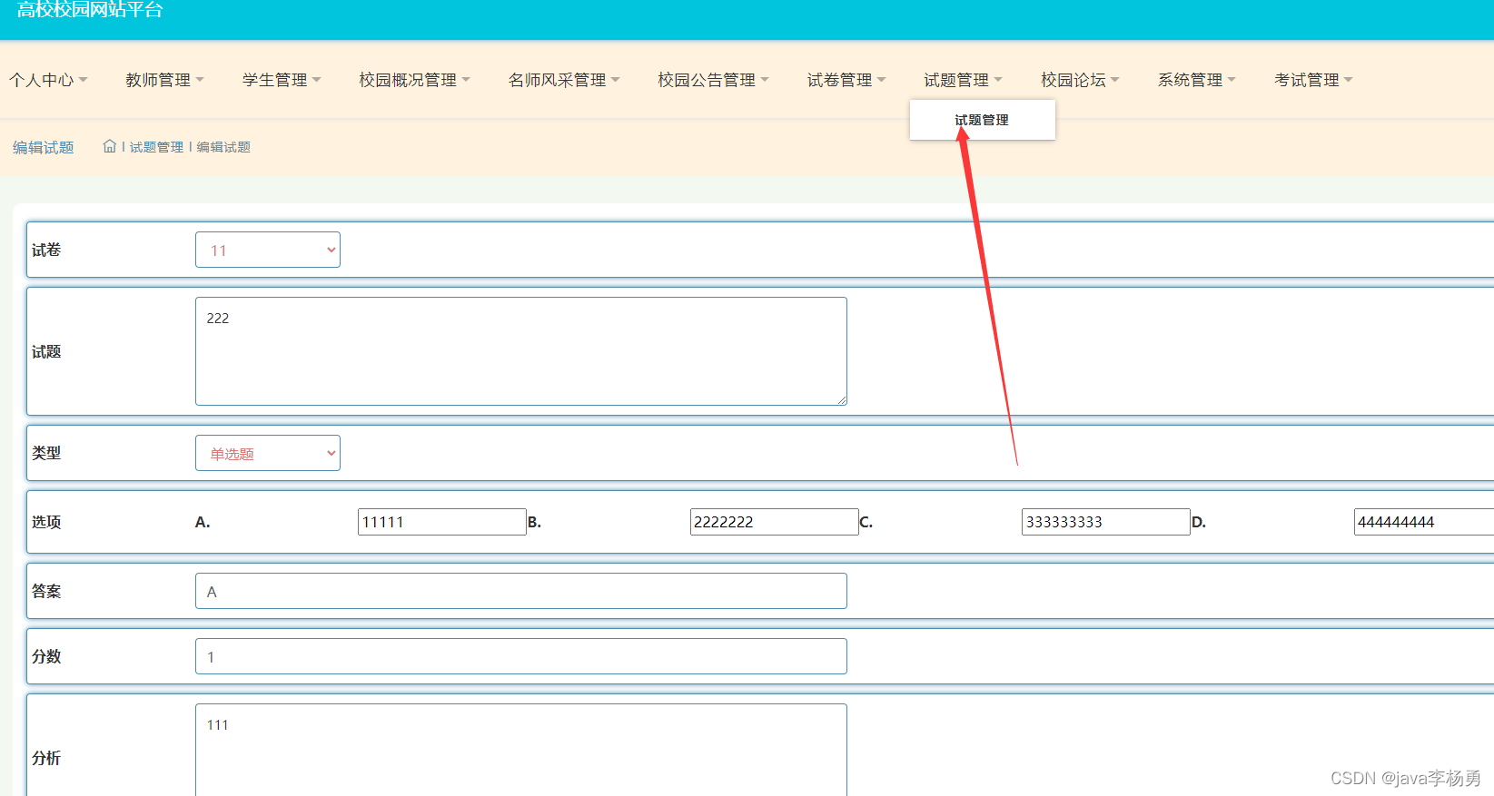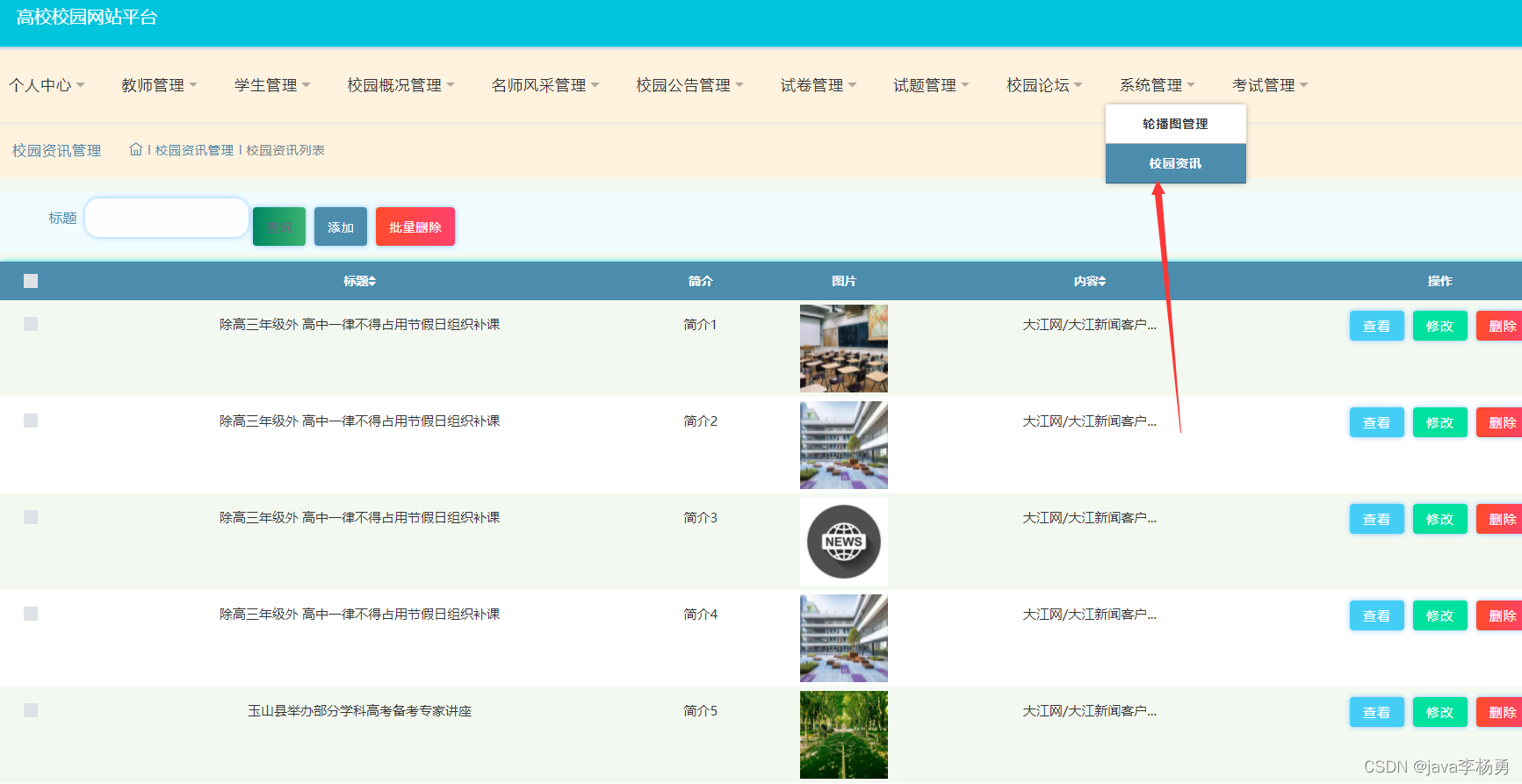 管理员主要功能:进入校园网站可以查看个人中心、教师管理、学生管理、校园概况管理、名师风采管理、校园公告管理、试卷管理、试题管理、校园论坛、系统管理、考试管理等信息