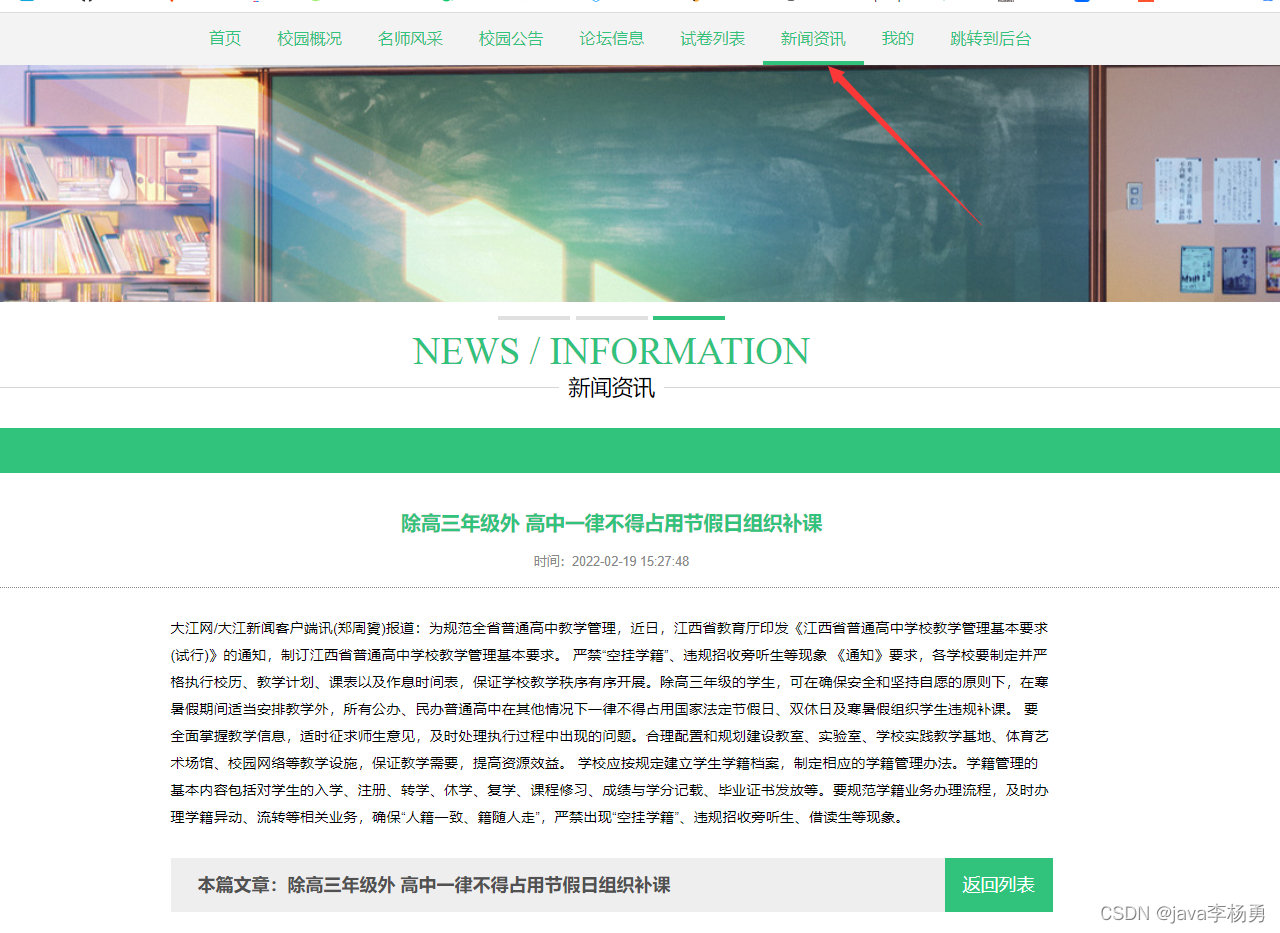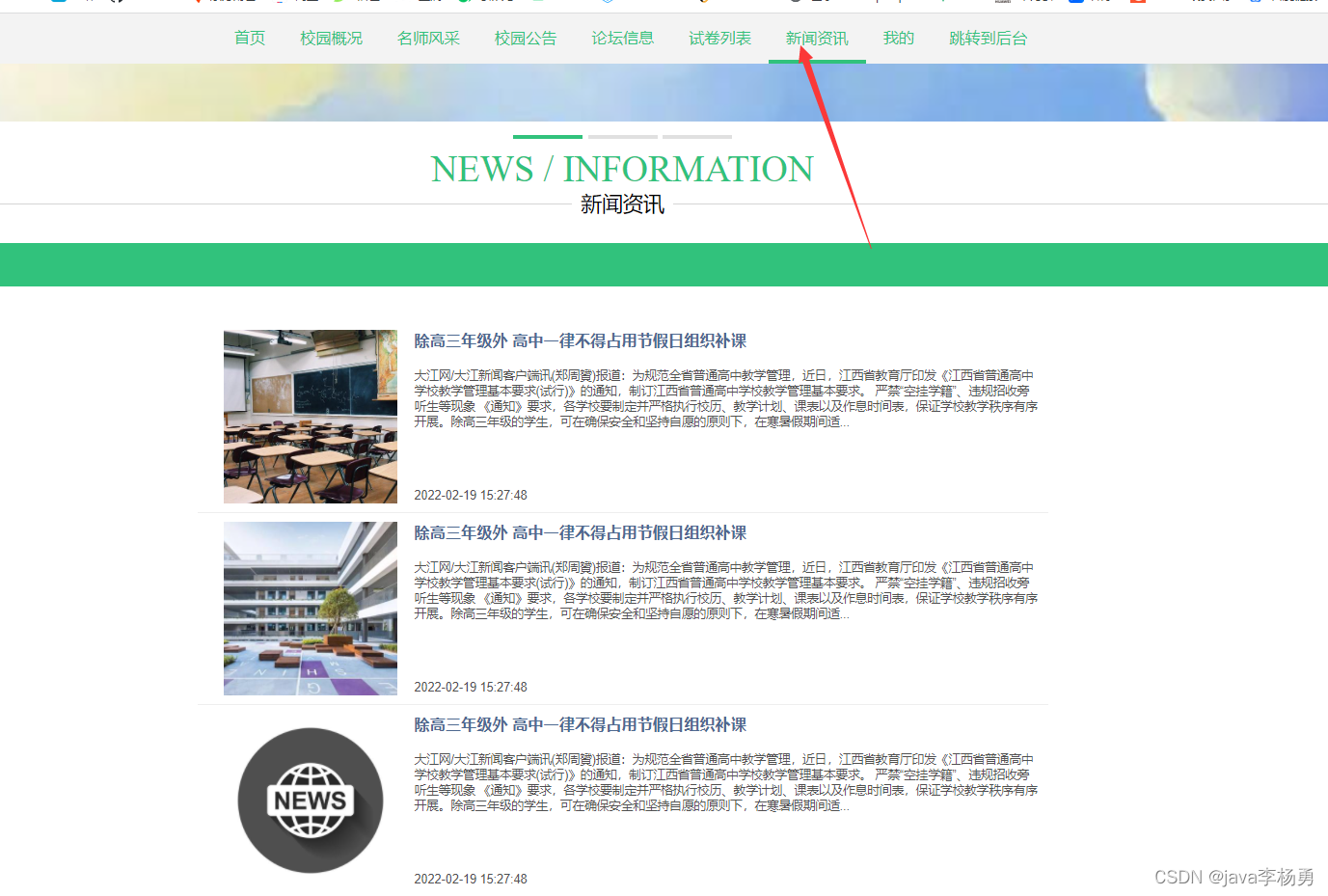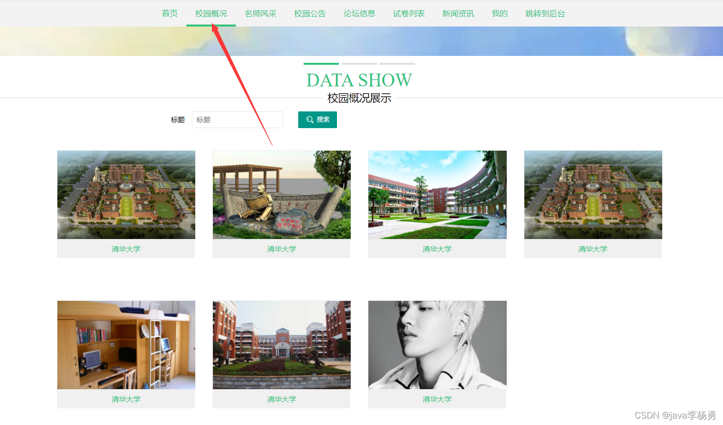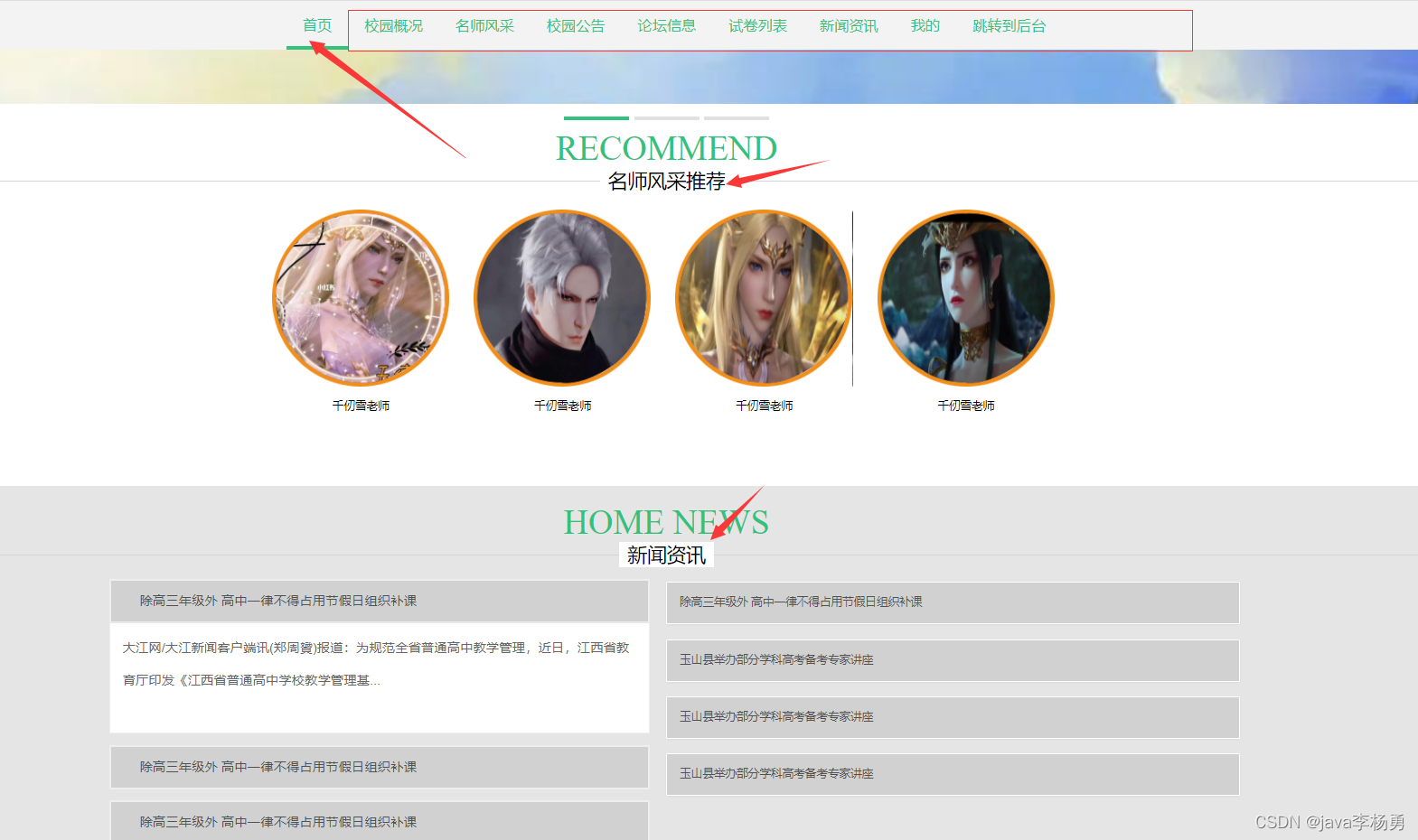 首页主要功能介绍:可以查看首页、校园概况、名师风采、校园公告、论坛信息、试卷列表、新闻资讯、我的、跳转到后台等内容
