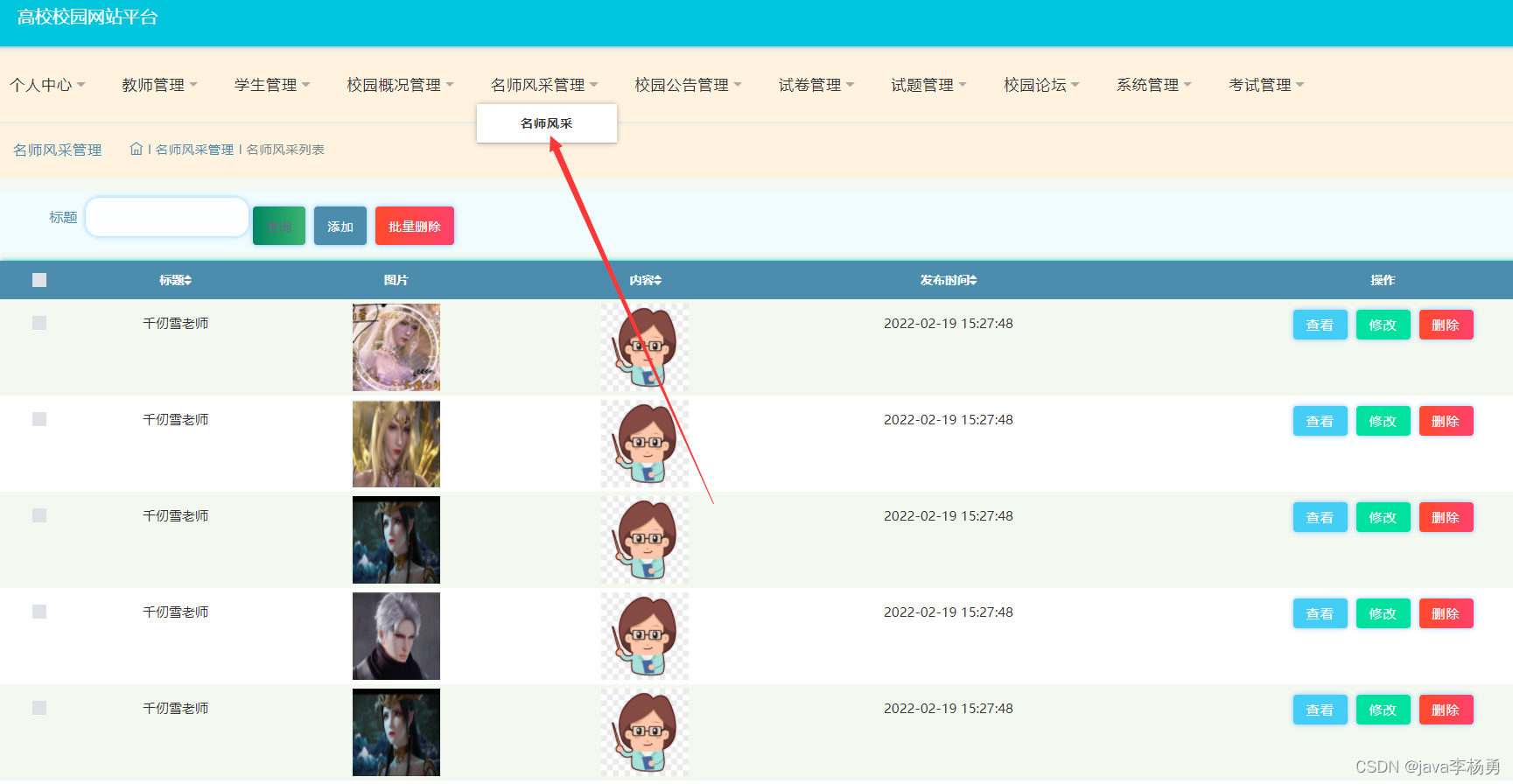 名师风采,在名师风采页面通过填写标题、图片、内容、发布时间等信息进行收藏
