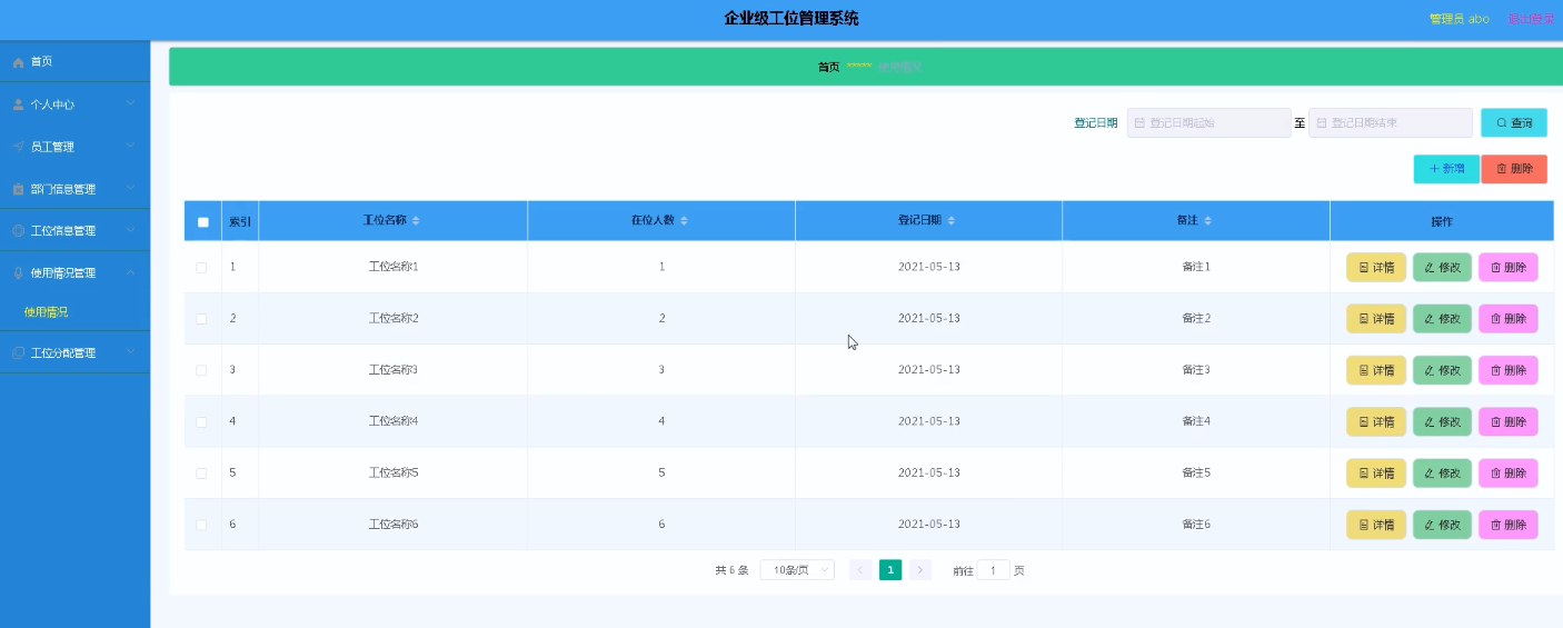 系统管理员可以对工位信息进行添加,修改,删除以及查询操作。界面如下图所示: