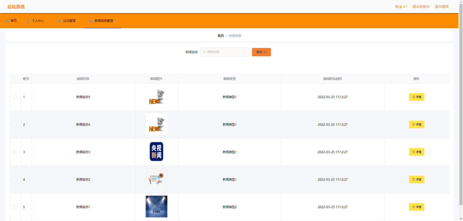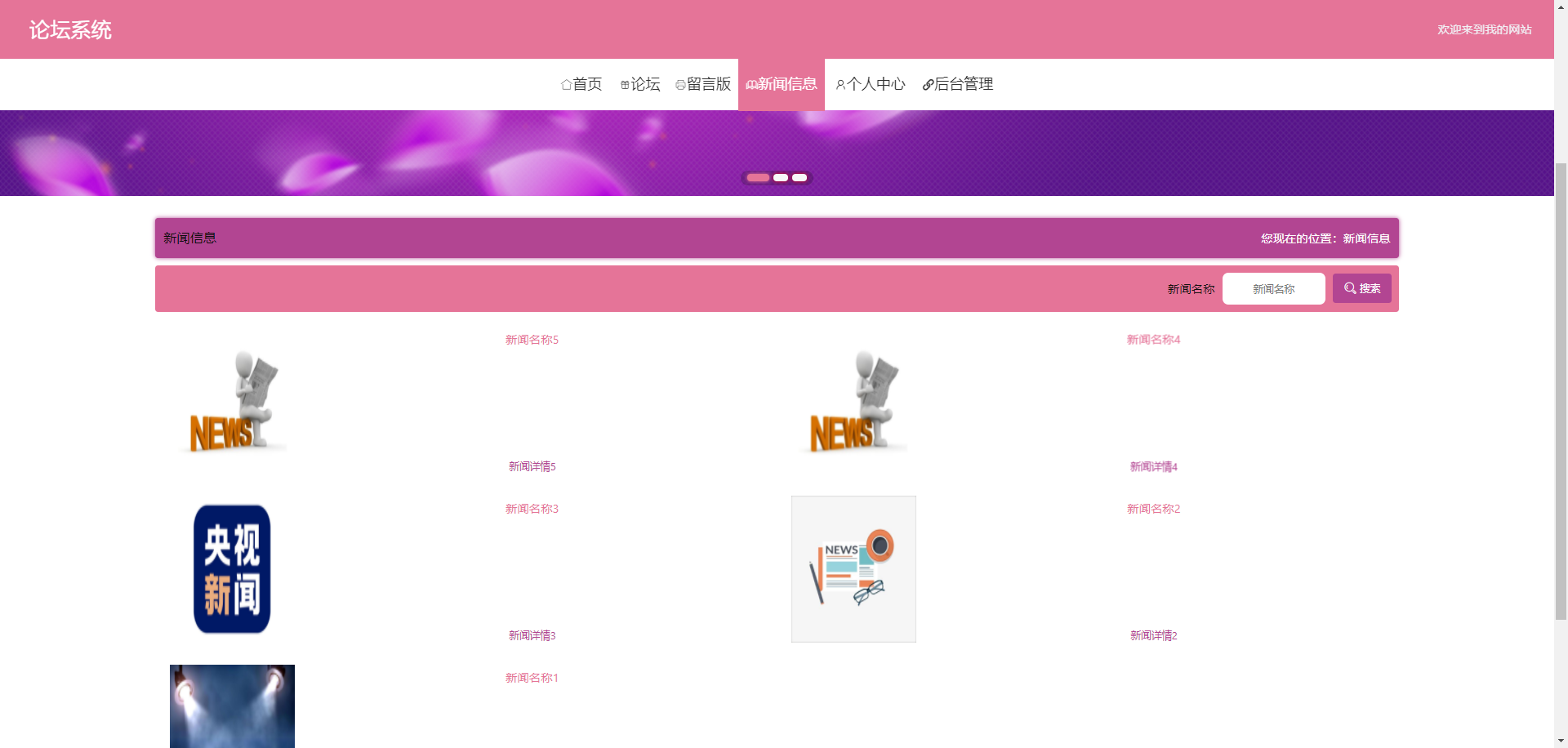 用户点击导航栏的新闻信息链接就进入新闻信息界面。新闻信息界面如图5.9所示。本功能允许用户查询新闻,对新闻具体内容进行查看。