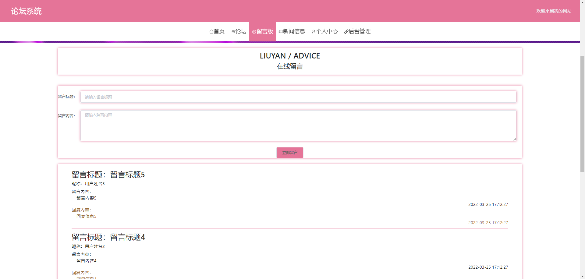 用户点击导航栏的留言版链接就进入留言版界面。留言版界面如图5.7所示。本功能允许用户与管理员交流,主要是需要用户先发布留言,管理员针对留言内容进行回复。