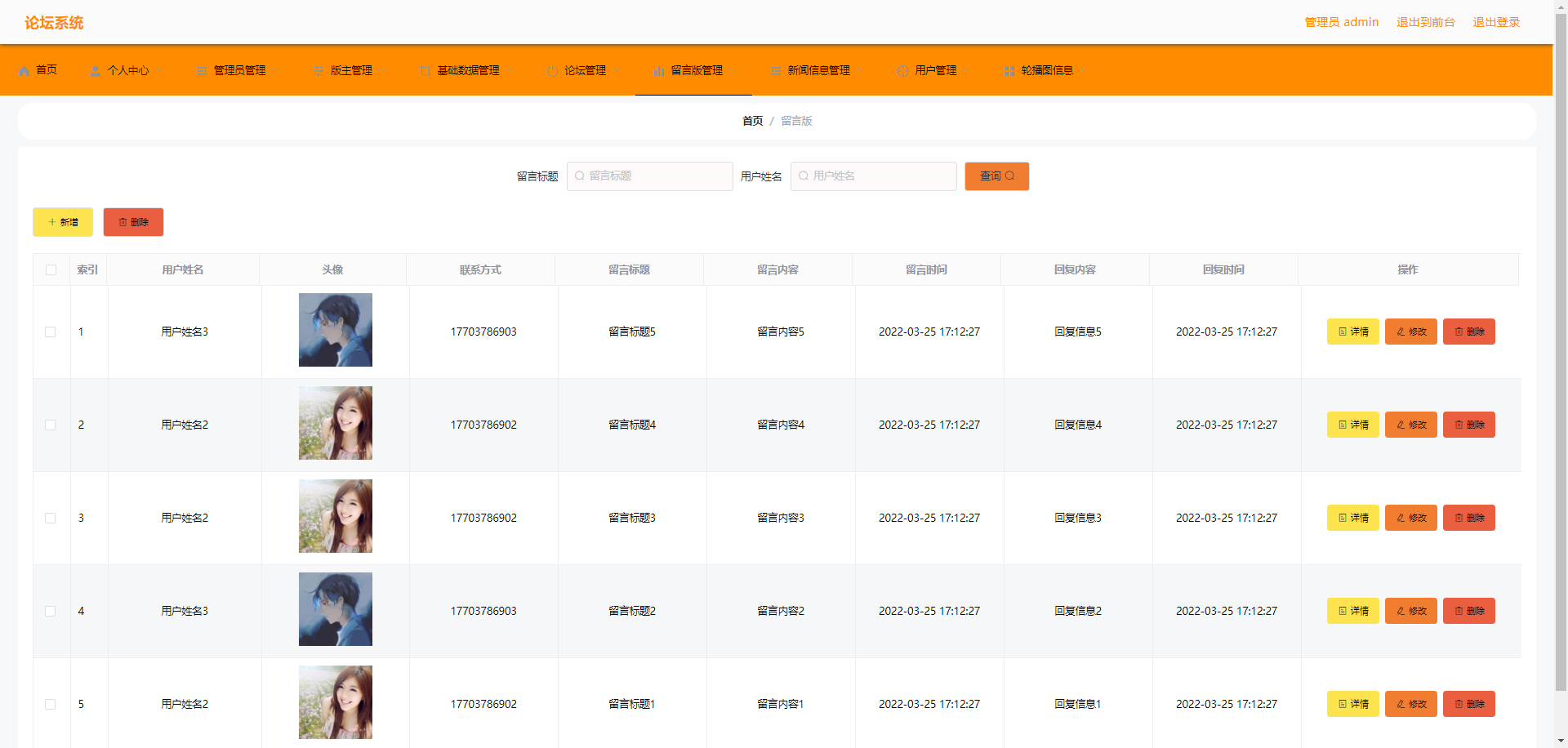 管理员点击导航栏的留言版管理链接就进入留言版管理界面。留言版管理界面如图5.3所示。本功能允许管理员查看用户留言,通过用户姓名或留言标题查询留言,回复留言内容,删除留言等。