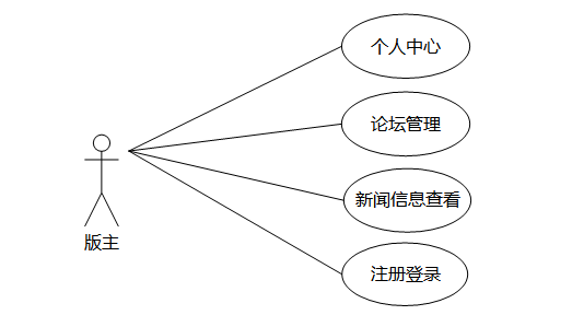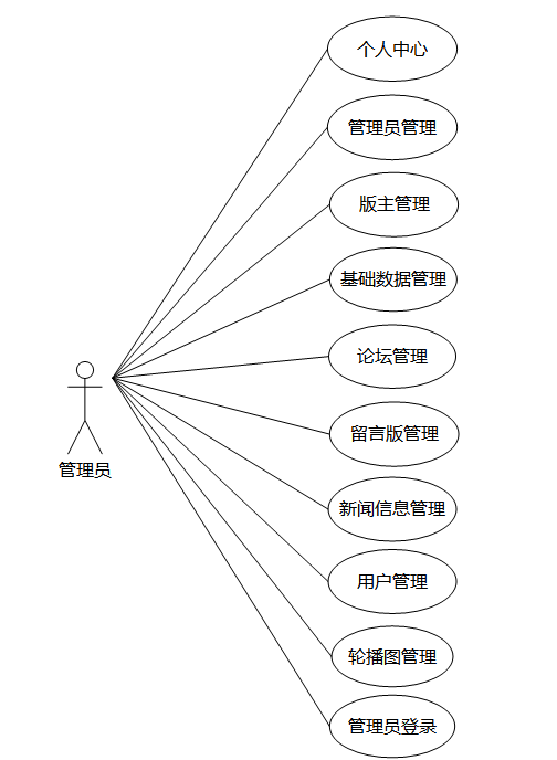 管理员管理论坛,主要是对论坛帖子增删改查以及对论坛帖子回复进行查看,对版主和用户进行管理,管理新闻等。对管理员的功能进行分析之后,将使用图3.4的管理员用例图来描述管理员的功能。