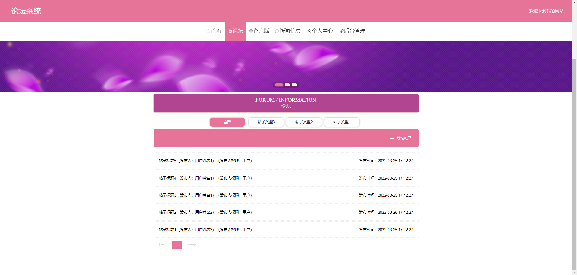 版主点击导航栏的论坛管理链接就进入论坛管理界面。论坛管理界面如图5.4所示。版主新增论坛帖子,论坛帖子有发帖时间,帖子标题,身份,姓名,手机号,帖子类型等信息,发布帖子之后,版主可以对论坛帖子的回复随时进行查看。